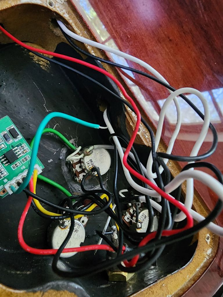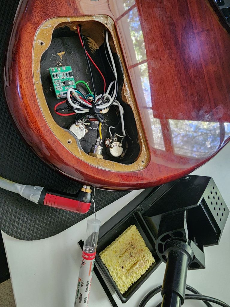 Here is a Ibanez GSR205SM Bass Guitar which came in for electronics repair and got a setup. Two wires in the control capitaly became disconnected when the potentiometer came loose and the whole potentiometer turned. A quick look at the wiring diagram allowed me to get it back up and running as good as new! Once the wires were soldered up, the potentiometers were tightened down to make sure this won’t happen again!