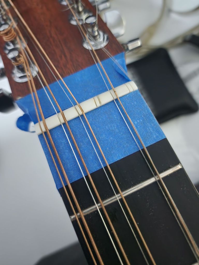 I proceeded to fill in the slows that were cut too low with material and a binding agent. Once hardened, it was almost like a new nut completely! I then proceeded to make new nut slots where the previous ones had been filled in. Being careful not to cut too far, I slotted the nut to the correct depth.