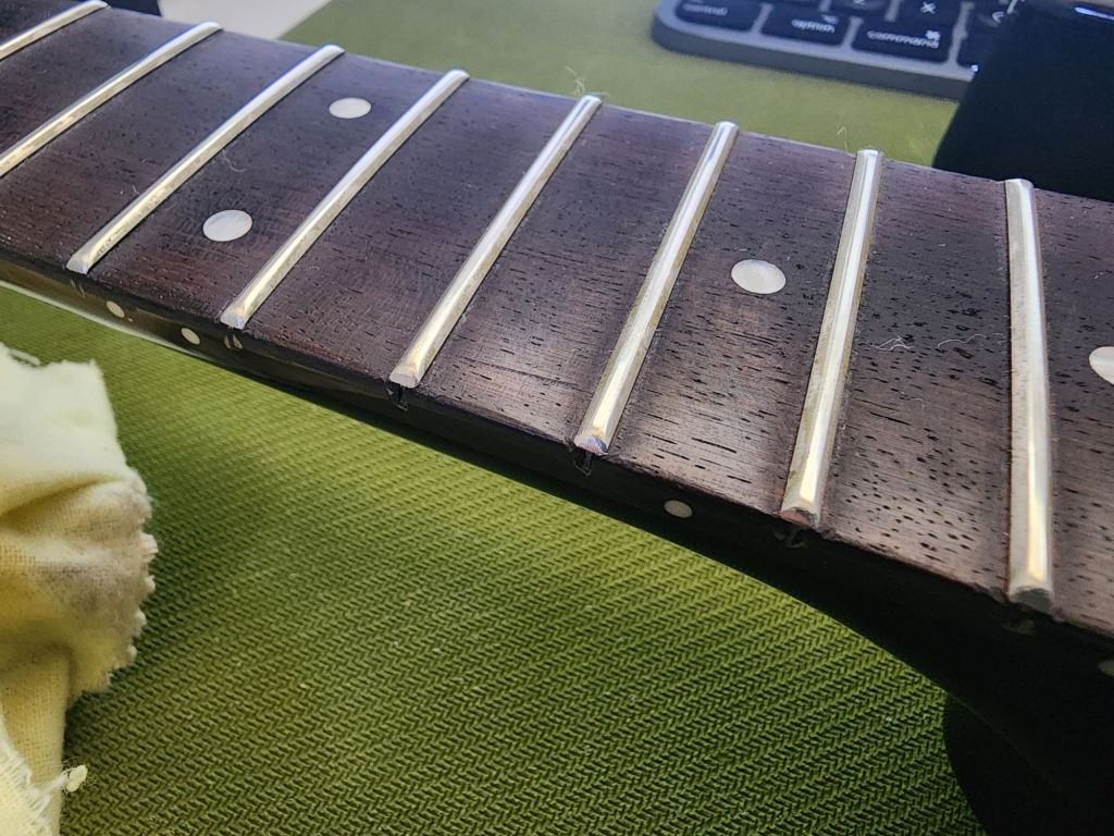 I went ahead and addressed the fret sprout by filing down the edges of the frets smooth. this will help overall feel of the guitar as the player runs their hands up and down the neck while playing.
